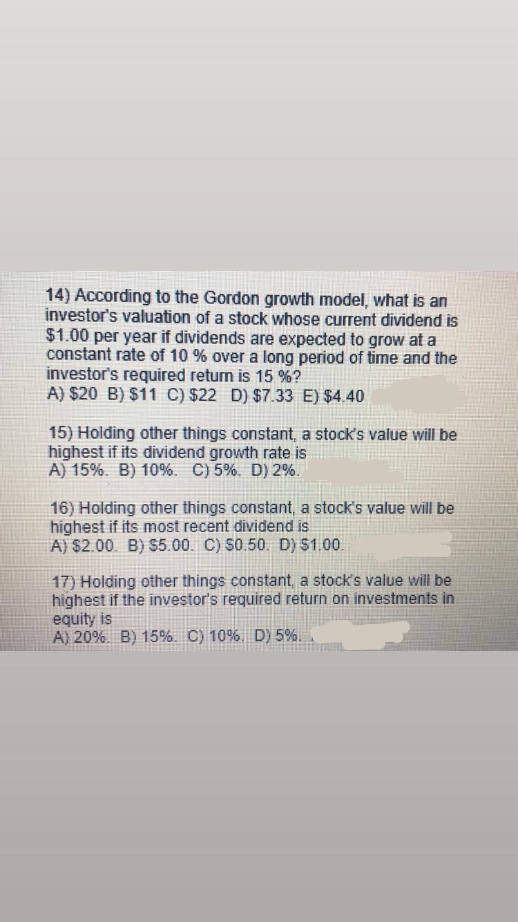 Solved 14) According to the Gordon growth model, what is an